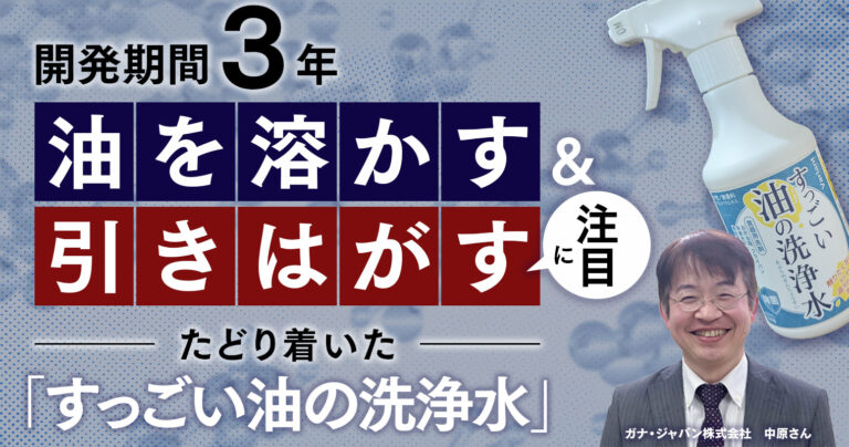 コロナ禍で大注目を浴びた『すっごい掃除水』。この製品を扱うガナ・ジャパン株式会社さんは、『すっごい掃除水』『すっごい水垢取り』など … 続きを読む 開発期間3年!油を溶かす&引きはがすに着目し、たどり着いた『すっごい油の洗浄水』